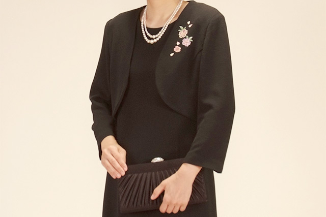 留袖ドレスは、結婚式で新郎新婦の親族が黒留袖の代わりに着る衣装です。和装の第一礼装である黒留袖をワンピースや2ピースに仕上げた格式の高いドレススタイルのフォーマルウェアです。