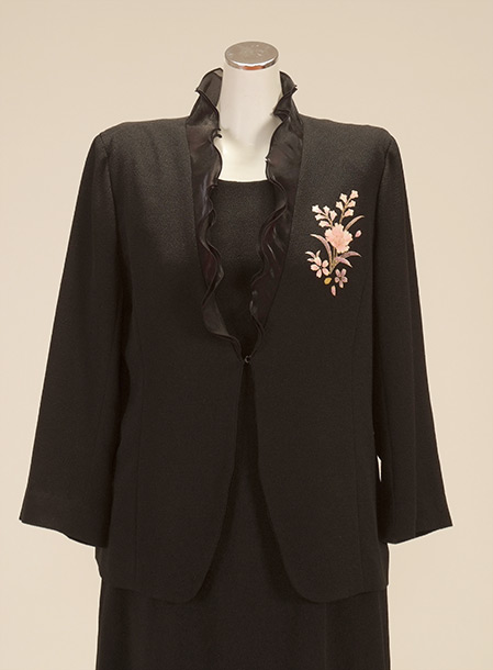 留袖ドレスは、結婚式で新郎新婦の親族が黒留袖の代わりに着る衣装です。和装の第一礼装である黒留袖をワンピースや2ピースに仕上げた格式の高いドレススタイルのフォーマルウェアです。